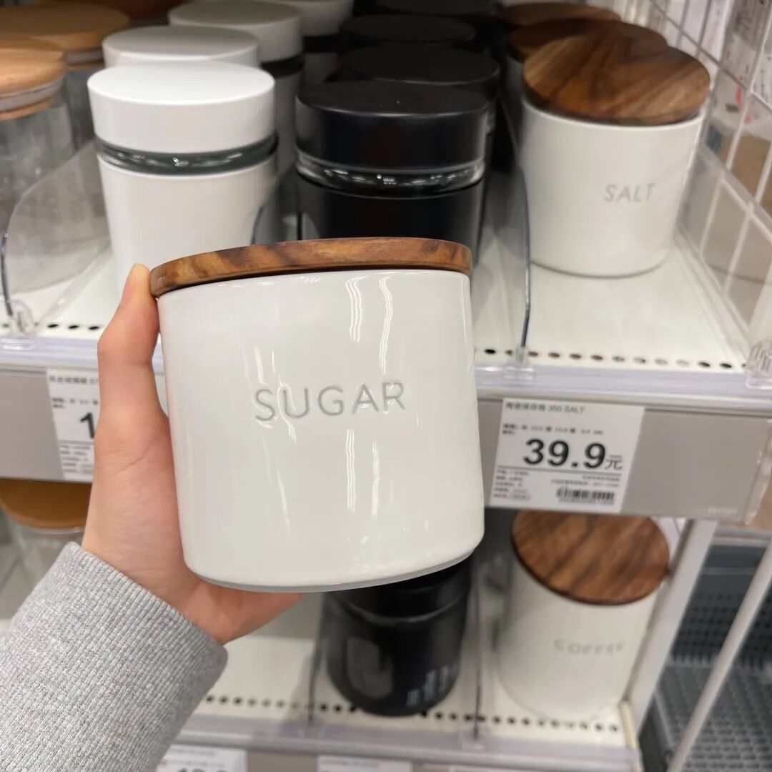 容量很大的调味料罐,可以用来装糖盐,上面还有刻字。奶白陶瓷罐身+木盖子,很乡村田园的感觉。