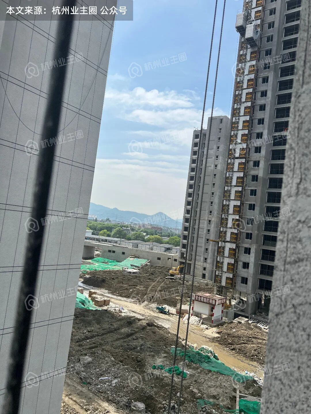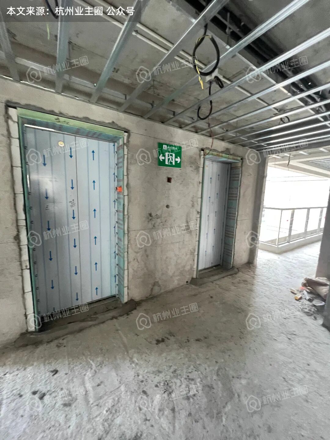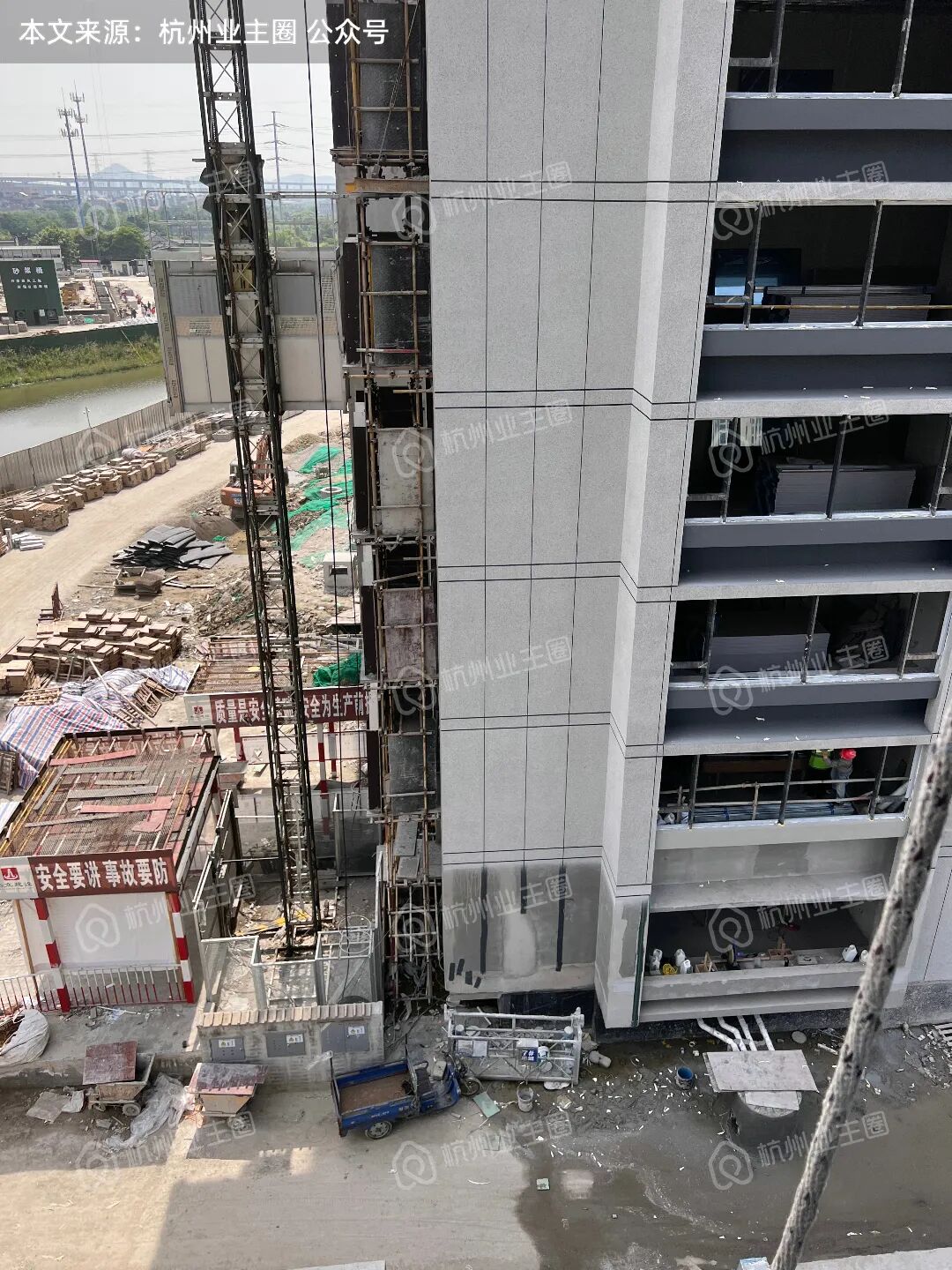 电梯轿厢已架设完毕,目前电梯门框底板搭建完毕;