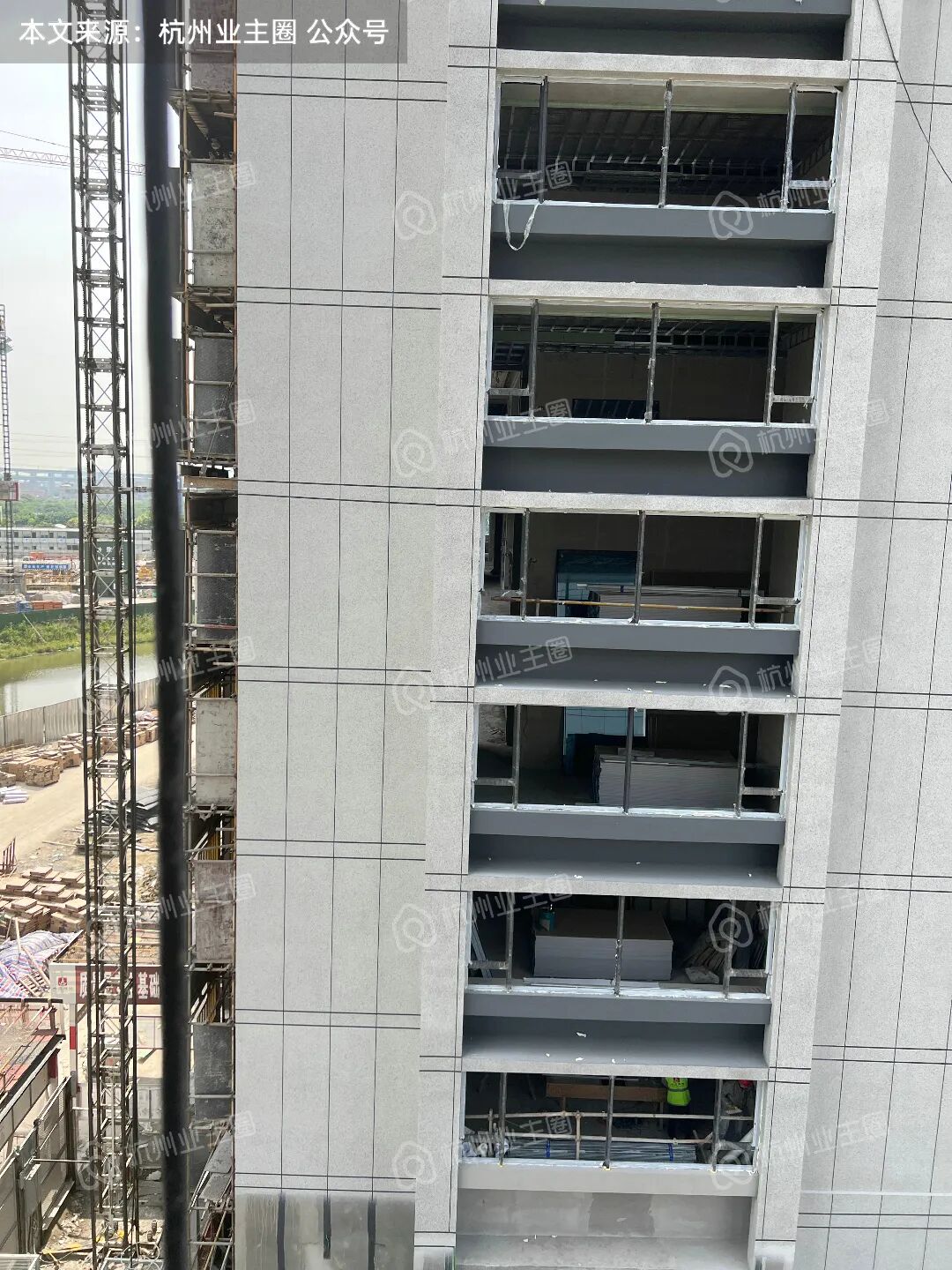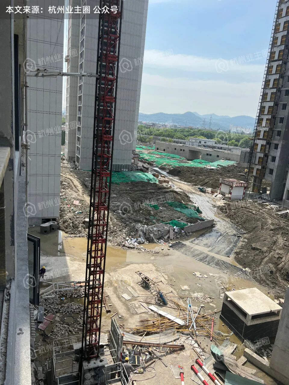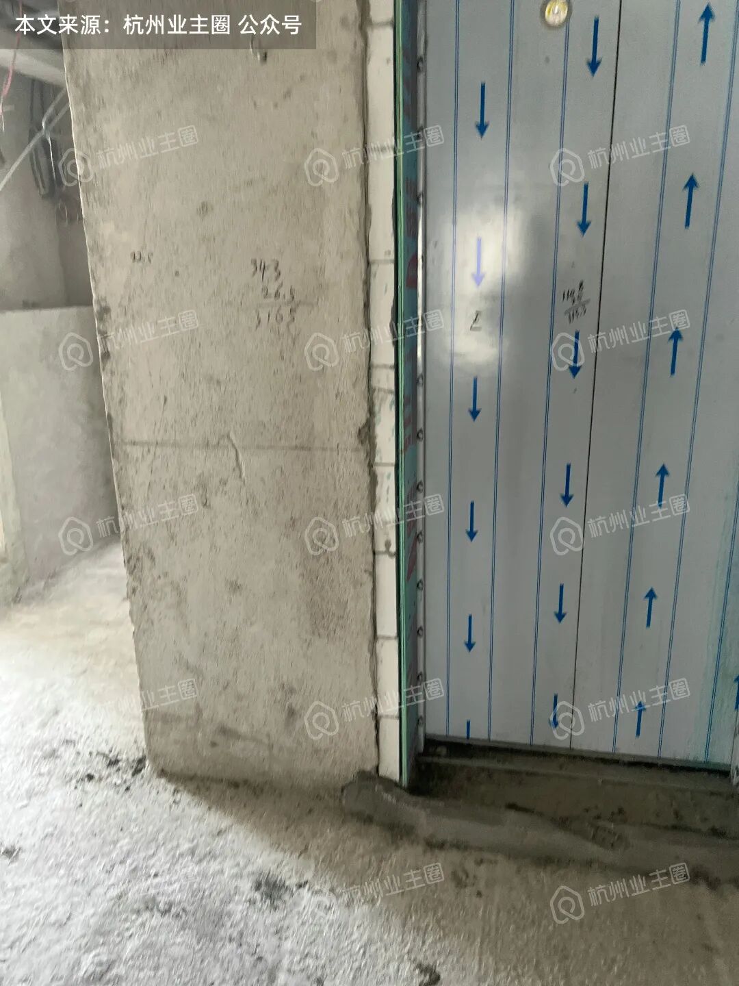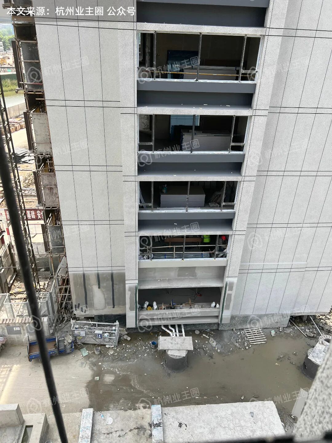 电梯轿厢已架设完毕,目前电梯门框底板搭建完毕;