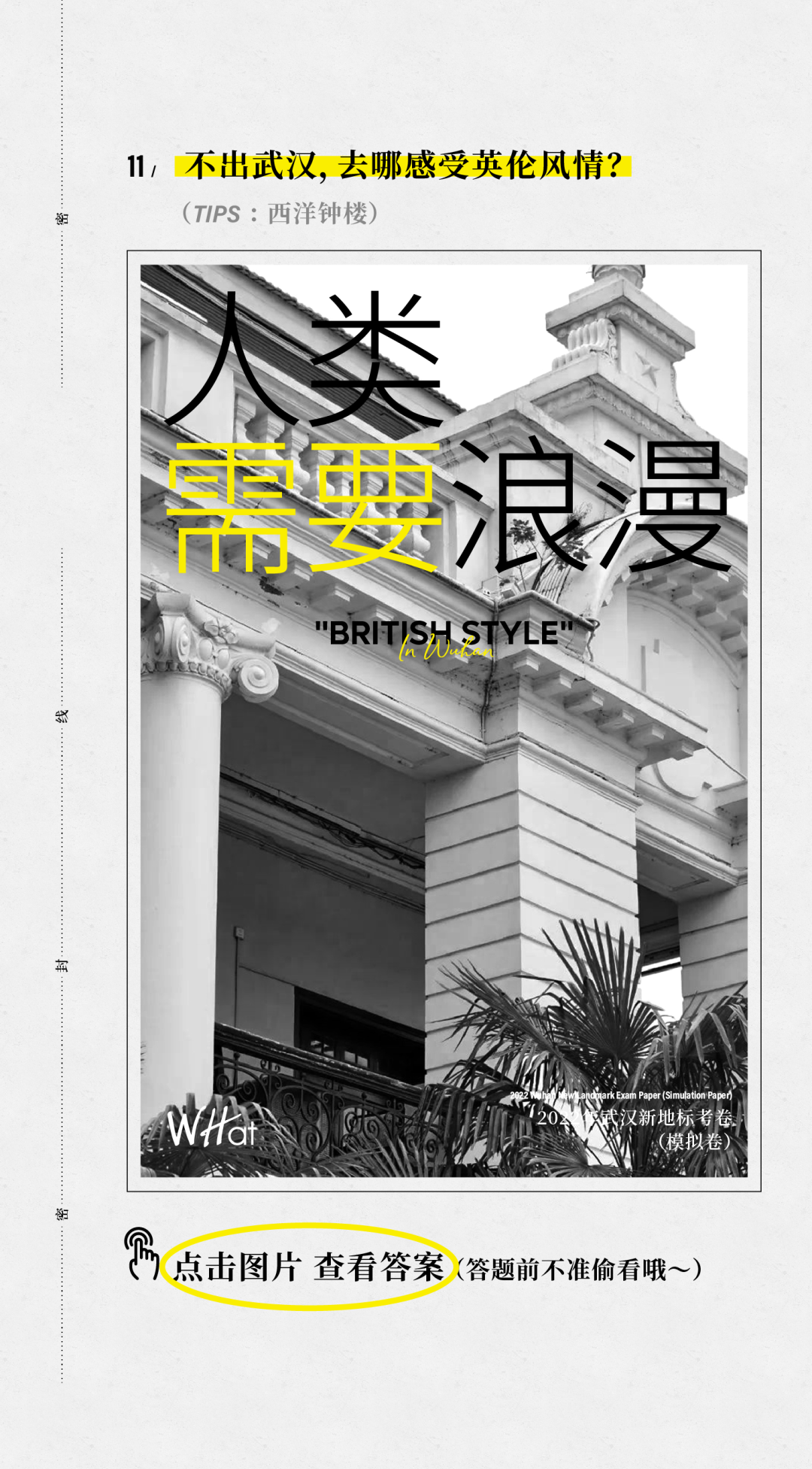 /// 恭喜你,完成了考试如果你拿到了60分以上那证明你在“追新”这件事上做得相当好啦! 虽然,从物理定义上的时间来说它们不是新事物从体量而言,也不全是宏大、庞然但因为和武汉人的生活有了新的情感联结它们被赋予了新的城市记忆成为了我们欣赏这座城市的新视角 希望这份模拟卷能让你对武汉的了解再多一分
