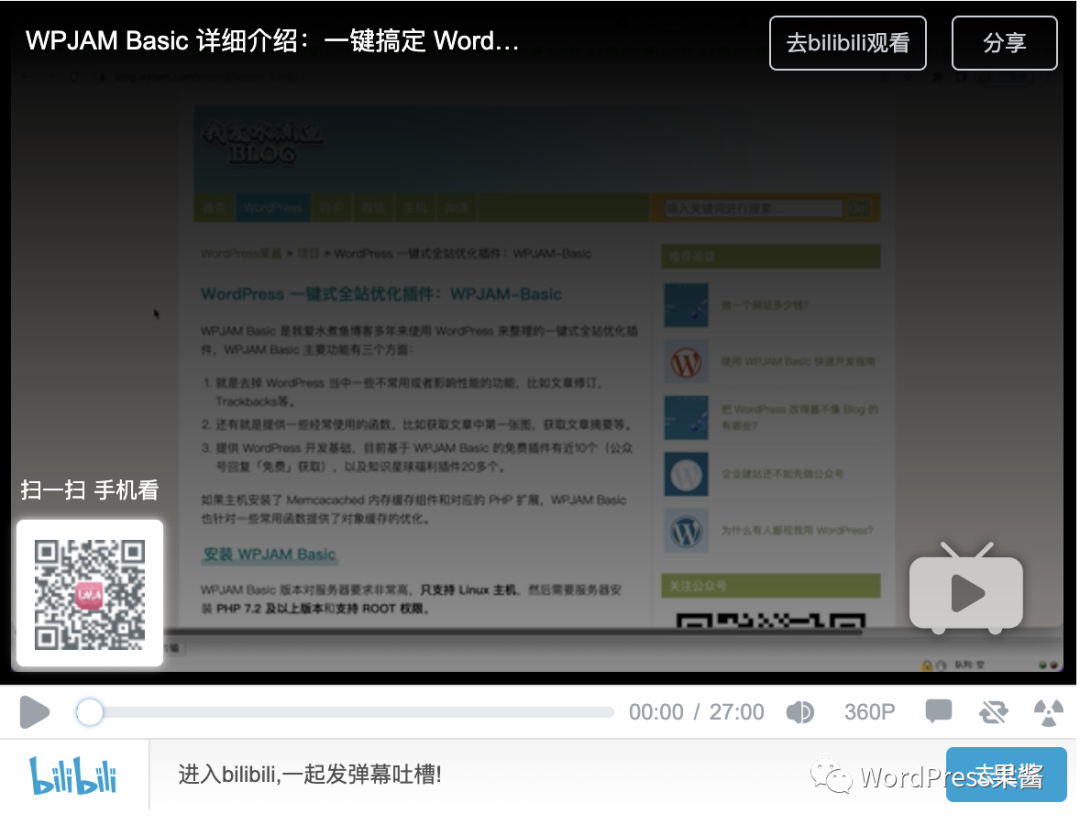 这几天我把B站的视频搬到博客中,发现 WPJAM Basic 早已经支持了短代码的方式插入B站视频。简单的通过下面的短代码即可: