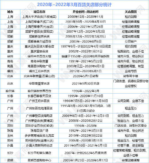 前几天就在网上看到了这样一份统计名单,是从2020年到今年3月部分关店的百货商场,既有位于玉林、许昌等三四线城市的,也有在北京、上海、深圳等大城市的,关店原因也是各有各的“不幸”。