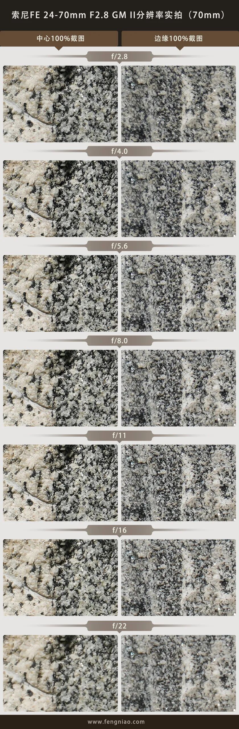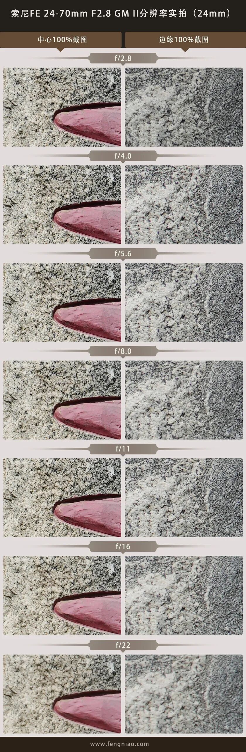 通过实际100%放大查看,可以发现索尼SEL2470GM2这支镜头在光圈全开的情况下,中心和边缘表现出来了非常高的锐度和对比度表现,整个画面所呈现出来的锐度我觉得非常不错,即便是收缩光圈至f/16,中心和边缘的画质也都不错,当光圈收缩至最小f/22时,画质出现了一定程度的下降,这一点和24mm的分辨率表现相当。