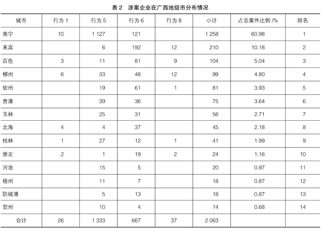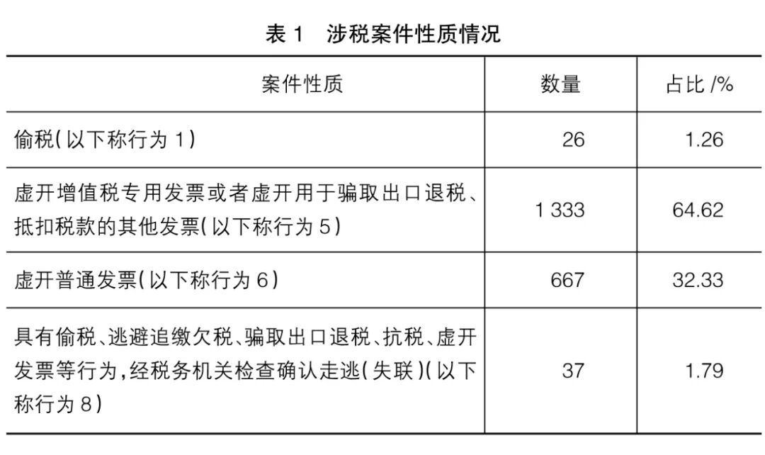 税收既是国家财政收入的主要来源,又是国家调控经济的重要杠杆之一,对经济运行发挥监督作用。依法诚信纳税,不仅是道德的约束,也是法律的要求。税收治理是国家治理的重要组成部分,在数字经济蓬勃发展形势下,深入开展案例研究,对不断完善新时代税收治理体系、提升税收治理能力,更好服务国家治理体系和治理能力现代化具有重要意义。 为加强税务监管,我国陆续出台了《关于对重大税收违法案件当事人实施联合惩戒措施的合作备忘录》《重大税收违法失信案件信息公布办法》《税收违法行为检举管理办法》等相关税收管理政策和办法,对规范企业纳税行为和进一步推动税务严格监管发挥了积极作用,但目前社会上仍存在不少税收失信、违规甚至税收违法的现象,信用缺失仍然是阻碍我国经济社会发展的“瓶颈”。2019年,“信用中国”网站公示行政许可和行政处罚等信用信息约1.97亿条,行政处罚信息达4063万条。截至2019年7月,新增失信联合惩戒对象名单信息69.38万条,涉及失信主体63.92万个。2019年国家在税务稽查方面频出重拳,截至2019年12月,税务稽查案件达60余万起。国税总局网站数据显示,全国共查处涉嫌虚开增值税发票企业超过13.4万户,涉案税额高达1236亿元。可见,整顿和规范税收秩序的任务仍然十分艰巨。 目前,我国学者对企业纳税信用、纳税信用体系建设存在的问题研究较多,对税收执法案例研究较少,尤其缺少对税收违法案件本身大数据的具体实践研究,从而在税收管理和信用体系建设中分析政策效应和提出优化措施时,缺少理论支撑,导致难以对症下药,事倍功半。因此,本文以2018—2020年广西公布的重大税收违法案件为样本,研究案件特征及其产生的内因、外因,并从宏观、微观层面有针对性地提出建议,可为国家出台政策、税务机关强化管理、企业加强诚信建设提供决策参考,助力社会经济高质量发展。 二、样本选择和分析方法 (一)样本选择 本文以2018年1月至2020年9月期间公布的、管辖地为广西的企业重大税收违法案件共2067起为研究对象,剔除4起涉及例如票面金额与税额明显不匹配等异常数据的案例后,剩余2063起案件为具体分析对象。相关数据信息全部从广西税务机关在国家税务总局重大税收违法案件信息公布栏获取。对少量案件公布信息表述不够清晰的,如未注明票面额是否含税的本文视为含税,未标明“增值税销项发票”是何种发票的本文视为专用发票。 (二)分析方法 本文采用定性和定量相结合的分析方法。 三、企业重大税收违法案件描述性统计分析 (一)违法行为种类分析 按国家公布的9项案件标准划分[1],2063起广西重大税收违法案件样本主要出现4项行为(见表1)。【基金项目】