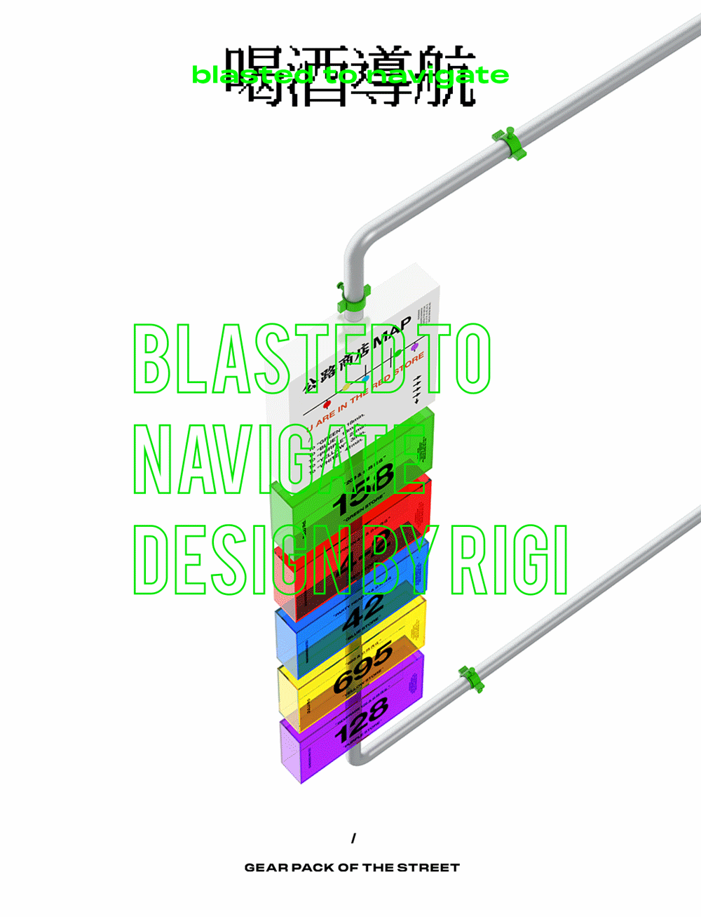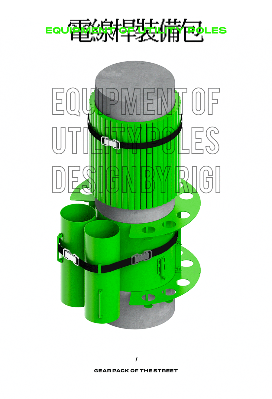 电线杆装备包 电线杆子永远是最性感的街头装置,不论小广告还是涂鸦,这是年轻人的公告栏,所以我们在尊重电线杆子权威性的同时,给它穿了一件机能装备,你可以放瓶酒,你也可以打一拳,有了这个装备,相信它会变得更自信。