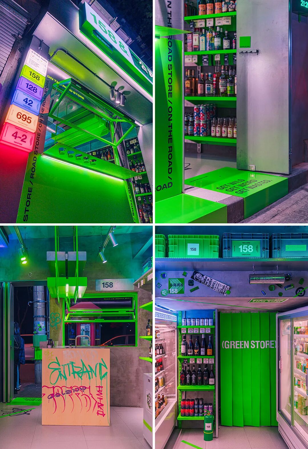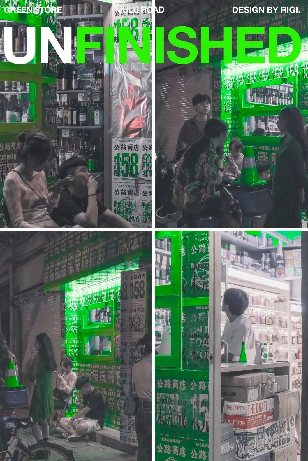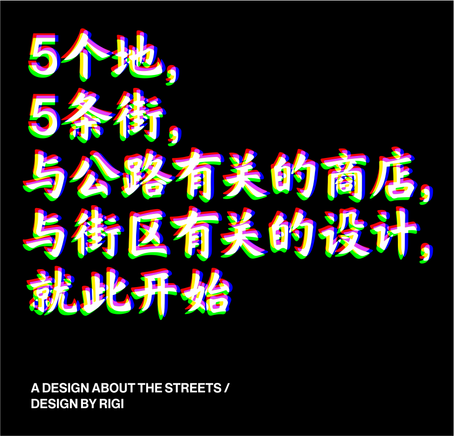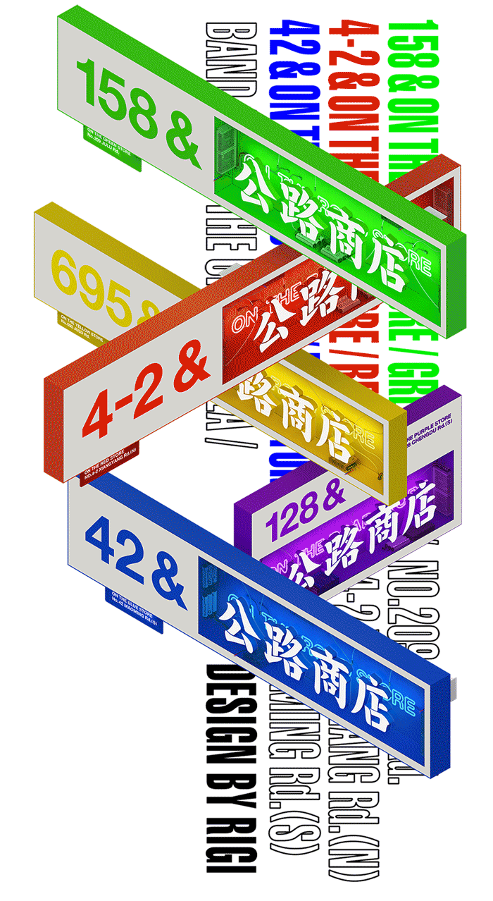 “2018年中旬,长乐路624号落地了第一家真正意义上的‘公路商店’。直到三年半后的今天,每晚11点后,你无法在624买到酒,因为考虑附近的邻里关系它会准时关门。但是你也很难驱散坐在门口开着afterparty的人群。 海明威的迷惘一代在巴黎的酒吧和咖啡馆里闲坐。这些移居国外的艺术家们在第一次世界大战仍在冒烟的废墟上敬酒,并通过在大街上饥肠辘辘地流浪,发现了一种具有艺术潜力的文化。我们这一代人也被新技术拉平了,但我们对信息和形象太过满足,无法孕育创造性突破。很荣幸这里是一个自由的渡口,事实上,在changle624&公路商店,人们聚集在这里是因为他们可以在这里感受到快乐而不是紧张。 今年的此刻,怀抱着复杂的心情,我们要和公路商店624说一声再见了。这里有慷慨为每个人按下快门,动不动就散烟的老黄,还有每晚都去襄阳公园舞剑,安慰过无数个失恋的小年轻,每晚将路人喝完的每个酒瓶都收回店里的英姐,也有公路商店的同事阿金在无数个夜晚的“布道”,就算是上帝也会来这里喝一杯。他们是624本身,也是公路商店永远的朋友。” 对RIGI来说,每一个项目都是社会某一面的需求呈现。 那个存在于长乐路624号的公路商店,或者你去过,或者你不曾知道,但它曾经存在过,甚至是一种现象,不论如何,我们需要一个新的开始。 5条路,5家店,5条马路,我们开始了这个设计。