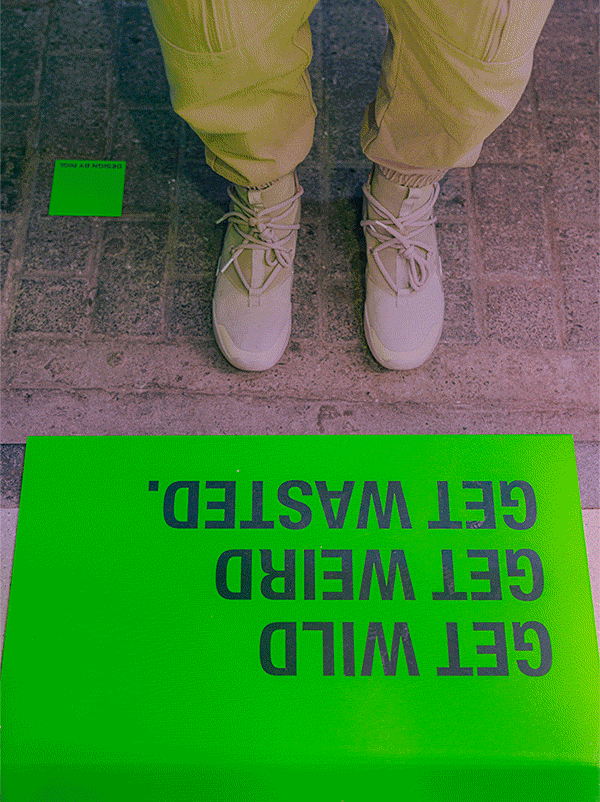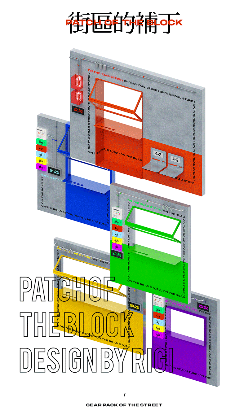 人要记住一个东西有很多方式,造型、材质、甚至通过情感。但颜色是一种最直接的方式,人的视线所到之处最直接的就是颜色。 在大众的普遍认知里,颜色被用来代表情感,红色是热情、蓝色是冷静、绿色代表和平。其实都是牵强附会,颜色就是颜色。既然我们做了一个破坏性的动作,那么我们就用一种最直接彻底的方式,把每一个店用一种最基本的方式去定义。就像是动物用气味划定地盘一样,我们希望大家通过这种浓烈的介质来标识,红店,绿店……等等。在街道打上补丁,划上地盘。