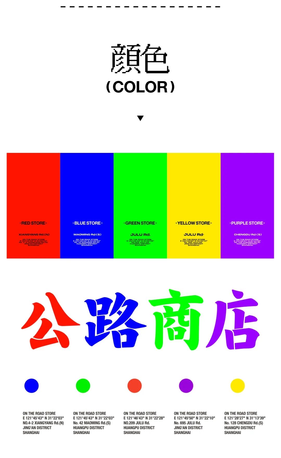 这次公路商店的新店分别位于:巨鹿路,襄阳北路,茂名南路,成都南路,4条既不相干又有所联系的路。 从根本上说,所有的店铺在城市的界面中,就像是街道上的一个个补丁,当然我们可以去找一切美好的词去形容这些补丁给一条路带来了什么,但事实上这些设计的作用就一个——“破坏”,这么听上去我们似乎并不是在做一件有价值的事。 所以我们需要的是——建设性的破坏。 我们需要给这些破坏补一个创可贴。