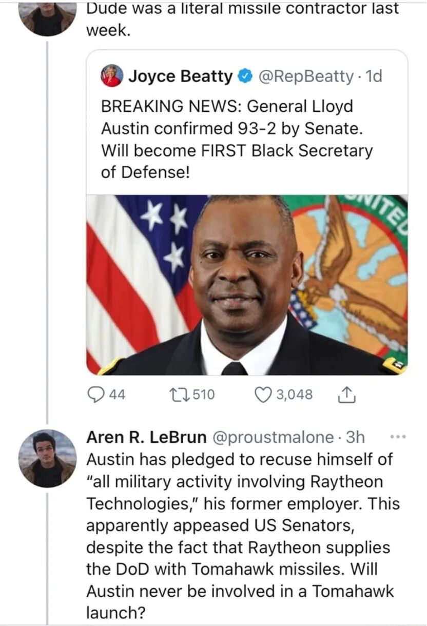 ▎网友对奥斯汀获任防长的质疑——“他上周还是导弹承包商”