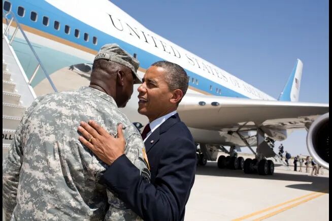 ▎通过肢体语言不难判断,奥斯汀已经是深得奥巴马信任的将领。图为2012年奥巴马送奥斯汀出征
