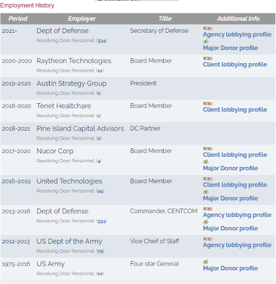 2016年,奥斯汀先是与布林肯成立了私人的国防军工企业,还成为了美国最大军火商雷神的高管。据福布斯统计,奥斯汀的“大部分财富——《福布斯》估计为700万美元——是在退休后为(雷神)董事会服务而获得的。”