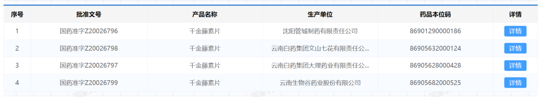 国家药监局数据库资料显示,国内有四家公司拥有千金藤素片的批文,分别为沈阳管城制药、云南白药集团文山七花公司、云南白药集团大理药业和云南生物谷(13.510, 0.63, 4.89%)药业,批准日期在2020年4月至7月之间,规格均为每片重0.05g(含千金藤素20mg)。