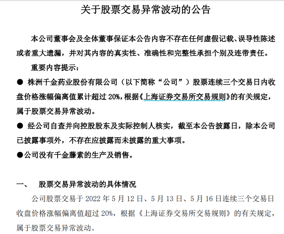 步长制药、华北制药、阿拉丁、大理药业等企业也发布公告,或澄清没有相关产品,或表示公司拥有的“千金藤素”产品销售额很小。