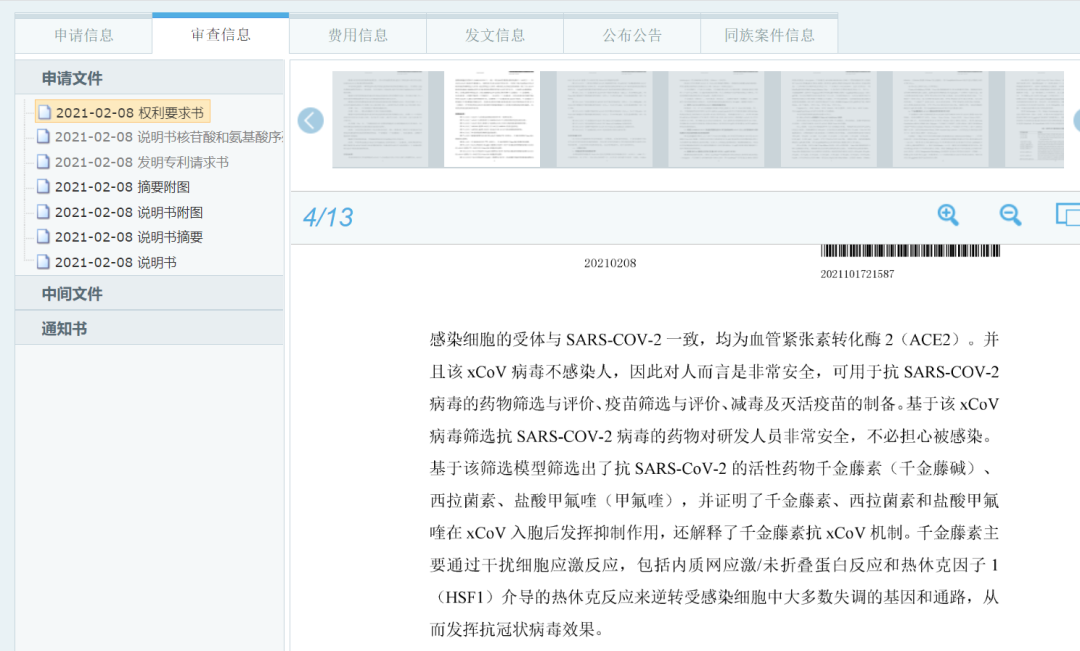 专利说明书显示,发明人从海关查获的死亡穿山甲中分离并培养出一株新的冠状病毒xCoV,称为穿山甲冠状病毒xCoV,其全基因组序列分析结果显示与SARS-COV-2(新型冠状病毒)的S蛋白同源性达92.5%,是迄今为止成功分离培养的与后者同源性最高的病毒,但该病毒不感染人,对人是非常安全的,可用于抗新冠病毒的药物筛选与评价、疫苗筛选与评价、减毒及灭活疫苗的制备。基于该筛选模型,选出了千金藤素等抗新冠病毒的活性药物。