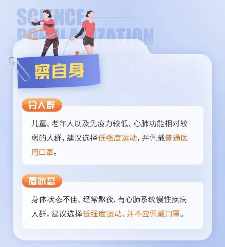 儿童、老年人以及免疫力较低、心肺功能较弱的人群,建议选择低强度运动,并佩戴普通医用口罩。