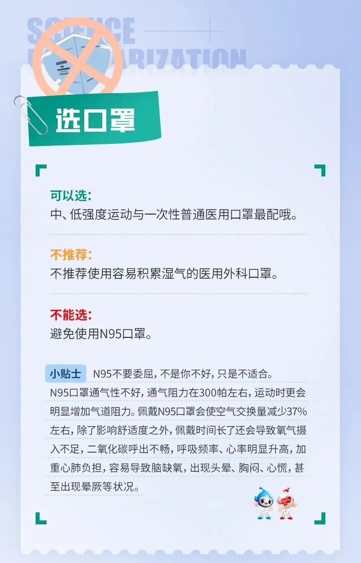 另外,建议尽量选择户外空旷场地,不扎堆、不聚集、错峰错时。同时,还要多准备几个口罩,在口罩被汗水浸湿时及时更换,避免使用汗湿的口罩。
