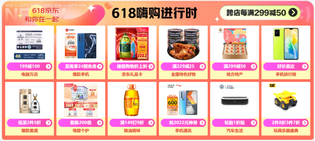 这次京东618活动,除了全平台跨店满减299-50,还有限时秒杀、红包雨、大额优惠券等活动。此外,京东还效仿天猫双11推出了好友组队瓜分红包的活动。