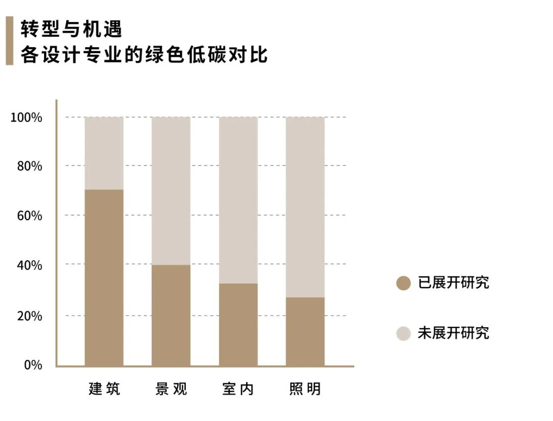建筑设计行业内已开展绿色低碳行动的机构达73%。景观、室内以及照明在该领域依然有较多的提升空间。