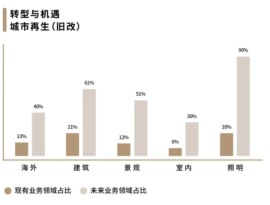 · 照明设计,作为与各设计专业相配合的设计专业,并跟随行业机遇积极拓展,故在城市再生(旧改)领域的现有或未来期望拓展达到90%之多。