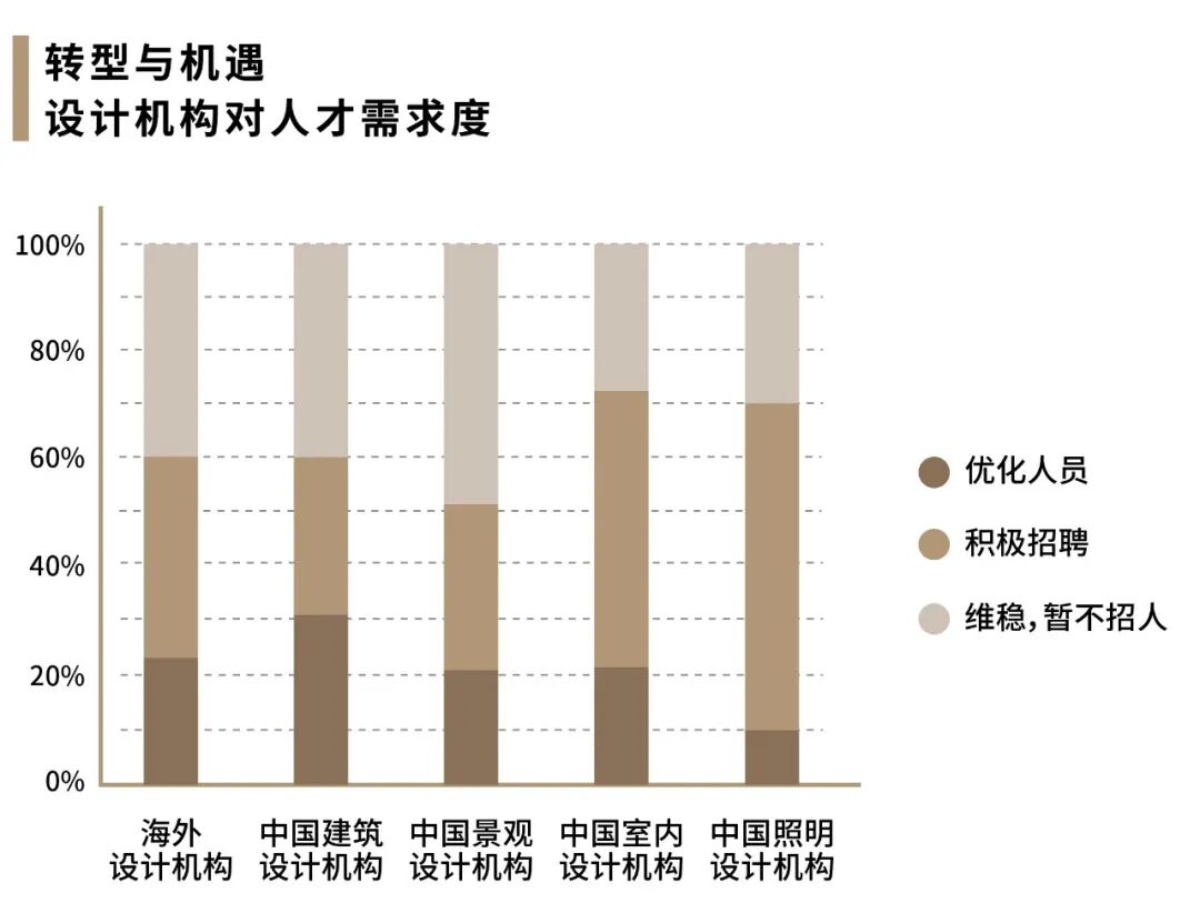 在新一轮的转型与机遇探索中,各大设计机构有不同程度的人员优化。但,对人才依然保持一定的需求,其中对建筑设计、景观设计、室内设计、照明设计等的人才需求依然是最高的,达到51%。但是,我们看到对创新技术的人才比例达到33%。