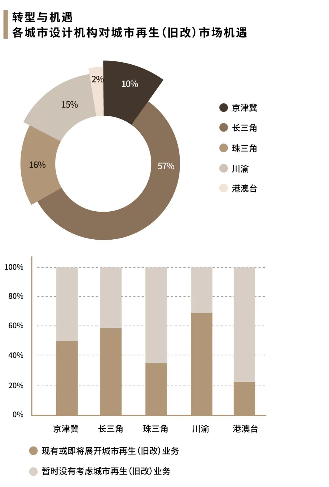 其中,京津冀、长三角、川渝三个区域内,超过半数的当地设计机构已有或即将展开城市再生(旧改)业务,川渝更是高达69%。