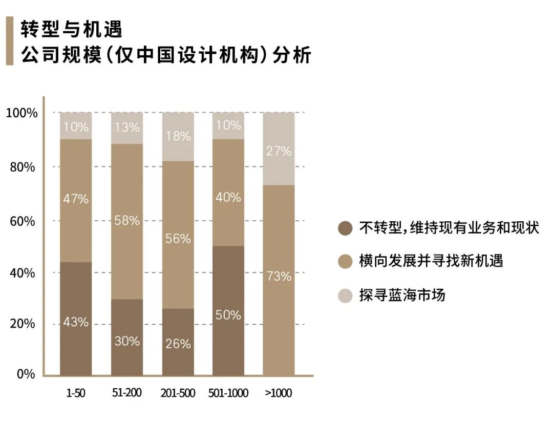 各设计机构几乎没有选择“躺平”,千人以内公司在维持公司一定现状的基础上,横向发展并寻找新机遇;同时探索属于各自公司领域的“蓝海”。千人以上规模的公司,更是在尝试寻找新的发展机遇和市场。