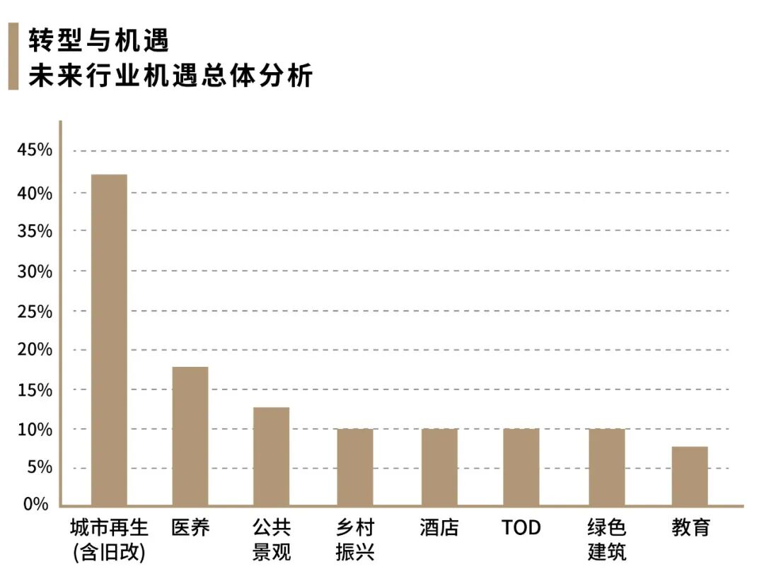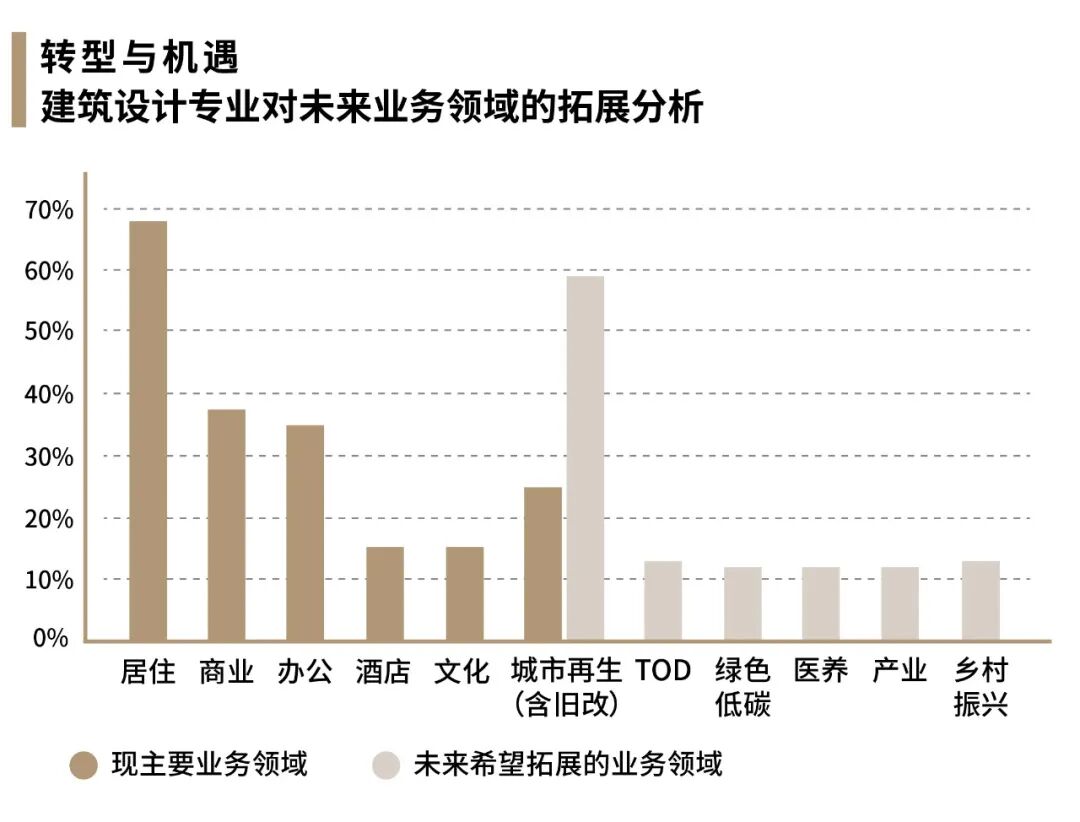 · 建筑设计机构除城市再生外,未来更希望拓展的领域分别是:TOD、绿色低碳、医养、产业、乡村振兴。