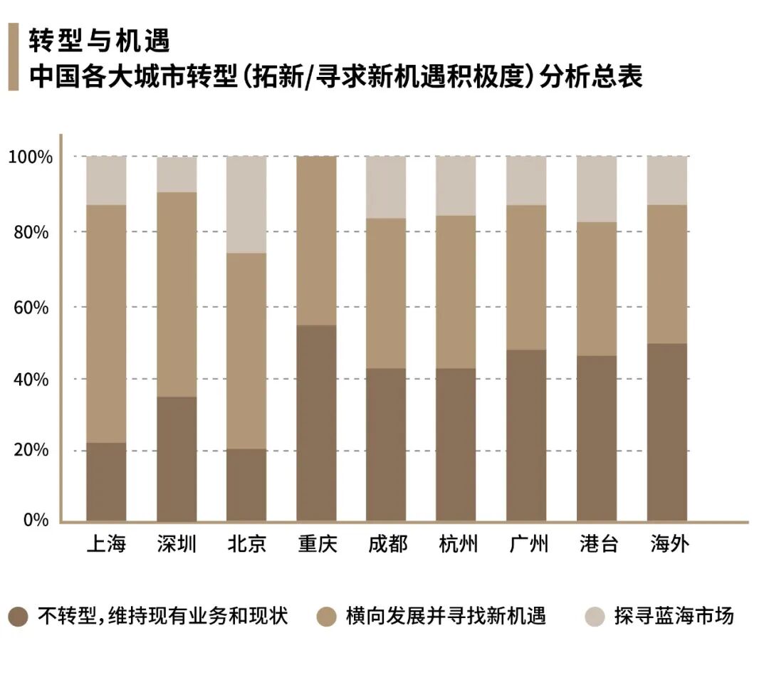 此数据以总部所在地为基础进行分析,调研发现设计机构总部位于上海、深圳、北京三大一线城市的中国设计机构积极进行公司业务范围的拓展并寻找新机遇,数据显示分别为65%、56%、53%;2020年发布的新一线城市:重庆、成都、杭州当地的中国设计机构在拓展新机会中表现最为抢眼。