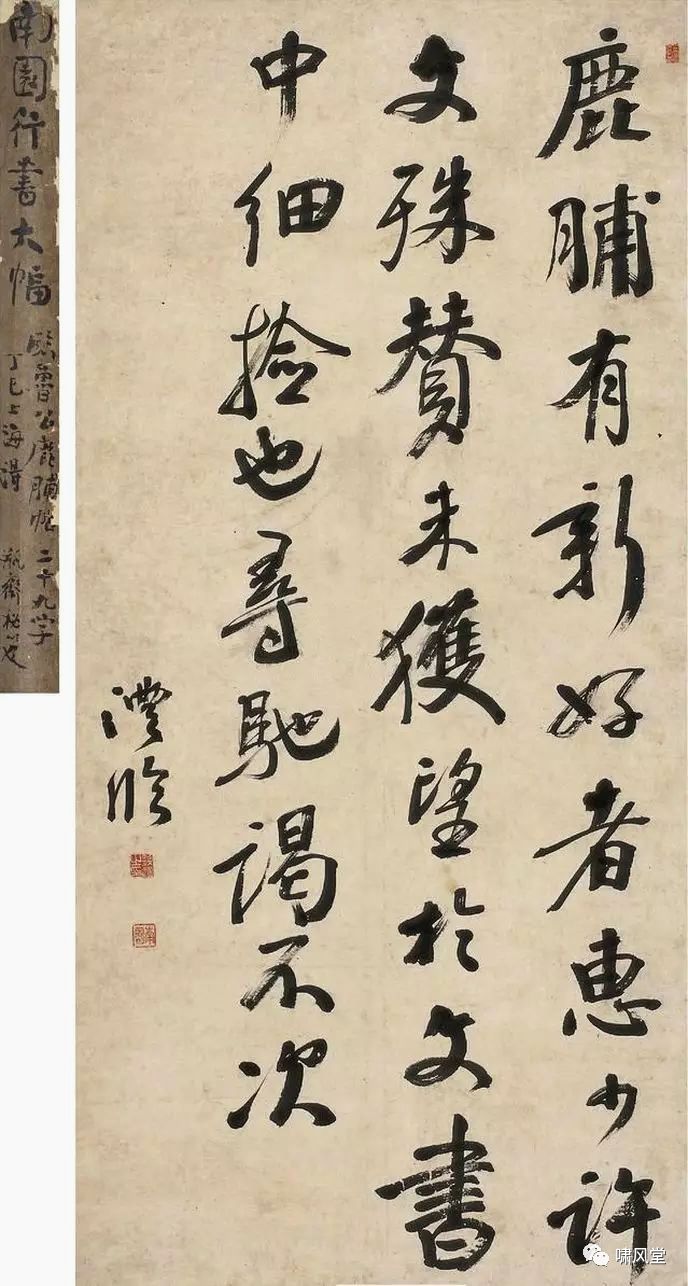 (图21),或疑非颜所书。但观《忠义堂帖》所收该书,大气磅礴,正非鲁公莫属。参阅《忠义堂帖》行草诸帖,尤其《刘中使帖》,笔力雄健,其纵横遒古,一如是帖。是诗,盖书于湖州任上,与《刘中使帖》相先后。明清论书家如王世贞、王澍重此帖。《弇州山人四部稿》说:“颜鲁公《送裴将军诗》多感慨踔厉,是公合作语……书兼正行体,有若篆籀者,其笔势雄强劲逸,有一掣万钧之力,拙古处几若不可识。然所谓印印泥、锥画沙、折钗股、屋漏痕者,盖兼得之矣。”而王澍以为有胜于《争座位帖》,其《虚舟题跋》直称:“书兼楷行草,若篆若籀,雄绝一世,余题为鲁公第一奇迹,不虚也”,“米海岳论《争座稿》,谓‘其字相联属,诡异飞动得于意外,最为杰思。’黄山谷云:‘奇杰秀拔,奄有魏晋隋唐以来风流气骨,回视欧、虞、褚、薛,皆为法度所掩,岂若鲁公肃然出于绳墨之外,而卒与之合哉。’二公推 许《论座》如此,余谓特未见此书耳。此书诡异飞动出《论座》外,盖自右军来未开此境,其心目中不复欲存右军一笔,盖所谓善学柳下惠,莫如鲁男子者也。然非有一段忠义郁勃之气发于笔墨之外,未由臻此”。高论如是,自寓深意。存世另有故宫博物院所藏墨迹本,低劣不堪,疑伪之说,或由是而生。