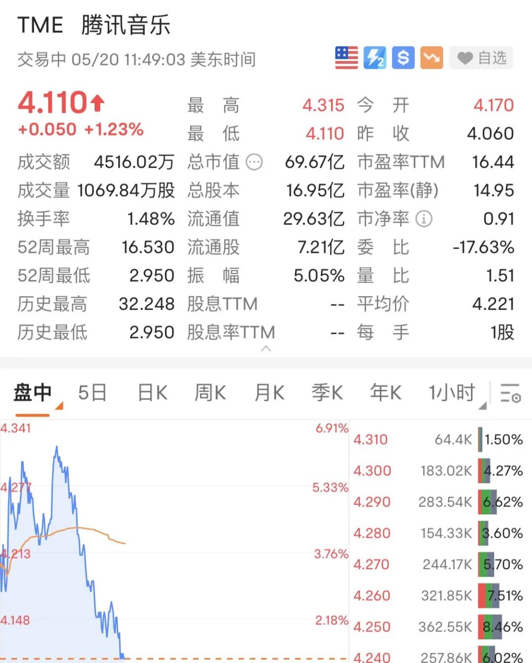 截止发稿,腾讯音乐涨幅回落至3.2%,报每股4.19美元。
