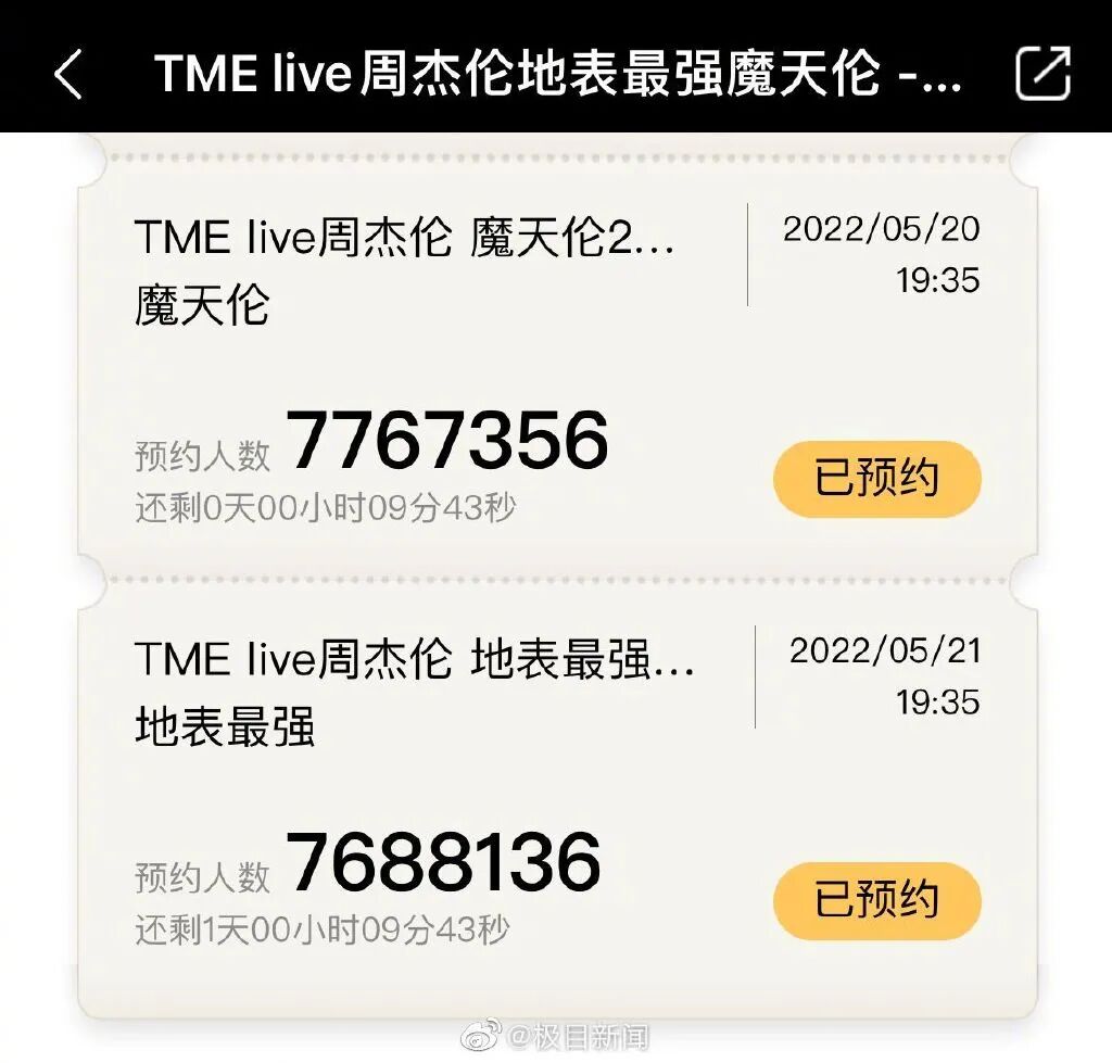 据极目新闻 ,在QQ音乐平台上,该平台已有近776万人预约观看周杰伦这场演唱会重映,再加上21日晚重映的周杰伦地表最强2019演唱会,两场演唱会的预约人数已突破1545万人。