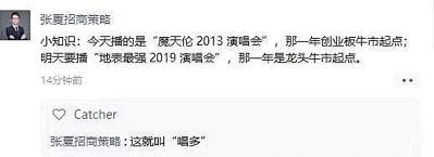 而在股票论坛中,却有人表示,周杰伦在2013年演唱会,那一年是创业板牛市起点。而5月21日晚间要播出的“地表最强2019演唱会”,那一年是龙头牛市起点。