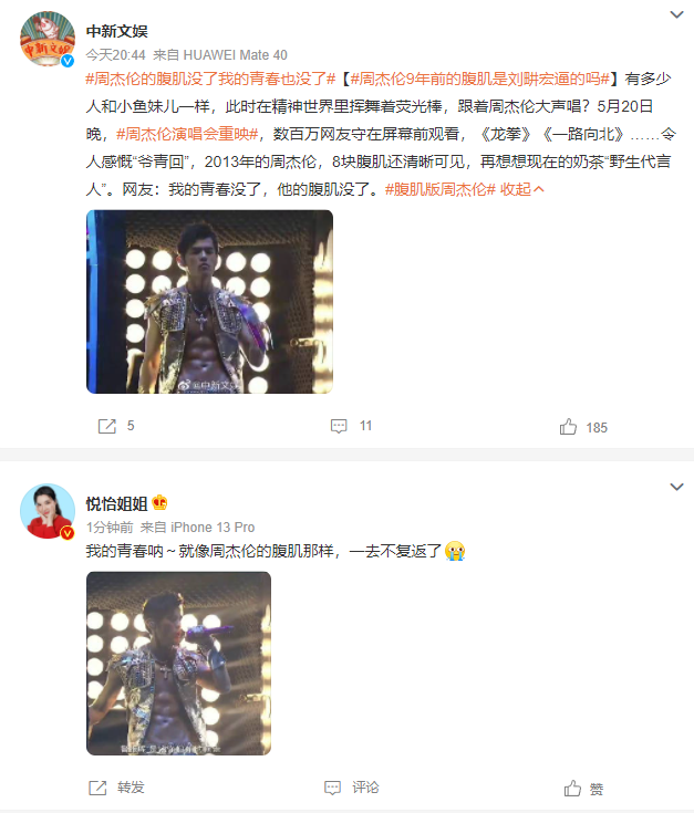 从演唱会可以看出,2013年的周杰伦,8块腹肌还清晰可见,再想想现在的奶茶“野生代言人”。网友称:我的青春没了,他的腹肌没了。