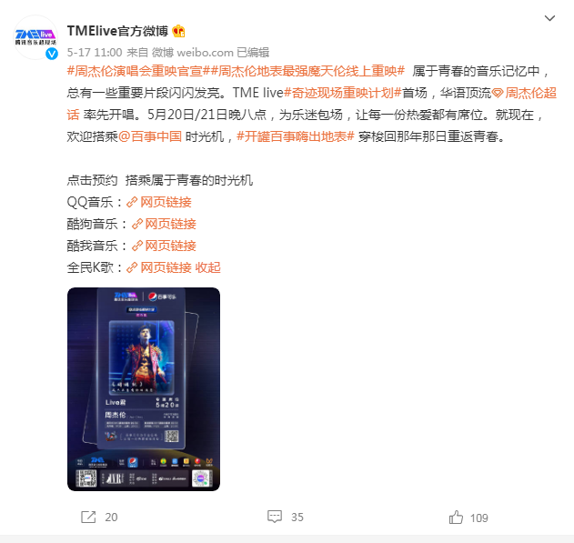 此前,5月17日,腾讯TME live官方微博官宣,将在5月20日、21日晚8点,线上重映周杰伦演唱会。