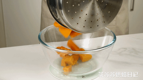 2.蒸好后放入碗中,用软刮板稍微压烂一下。
