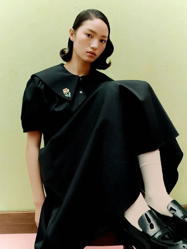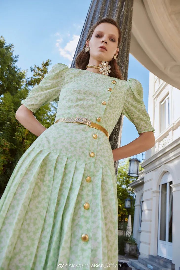 娃娃领是娃娃裙的要点之一。Alessandra Rich的礼服设计风格融合了简朴、现代、优雅和摩登于一身,华丽晚礼服常常以闪耀珠宝作为璀璨点缀,在任何场合都能被强势聚焦。