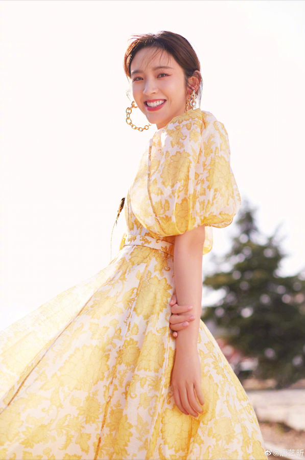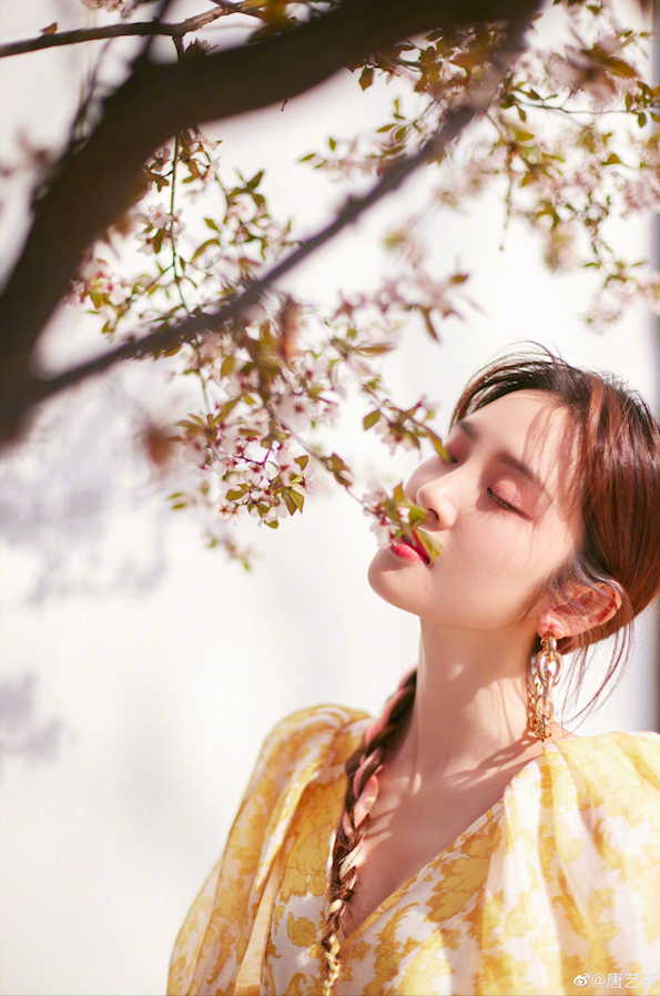 唐艺昕的赏花look也美出新高度,嫩黄色的连衣裙+蓬蓬的泡泡袖,呈现出来的复古韵味相当撩人。