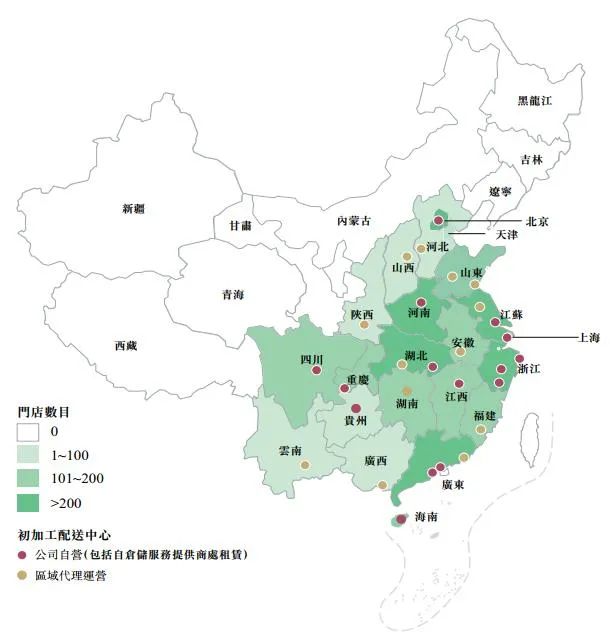 资本加持之下,公司成长为中国最大的水果零售企业。截至目前,百果园在全国22个省市超过130个城市,拥有5351家门店;同时,线上渠道初具规模,涉及平台包括百果园APP、微信小程序、天猫、京东、抖音等电商平台,以及美团、口碑和饿了么等第三方送餐平台。