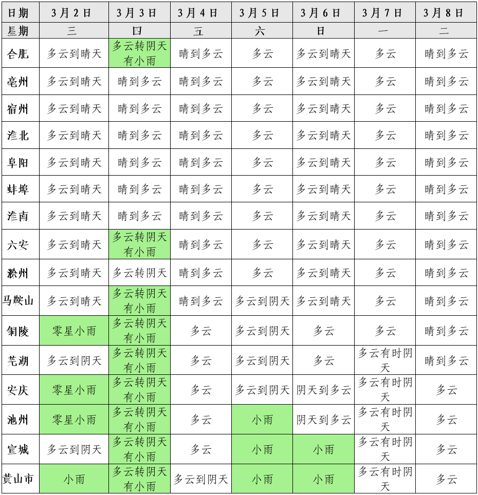 据安徽省气象台预报,3月6日前,我省江北以晴到多云天气为主;江南多弱降雨,其中5-6日受弱冷空气影响,全省平均气温将下降3~5℃,同时平均风力增大到3~4级,阵风7级。7-8日江北晴到多云,江南多云有时阴天。