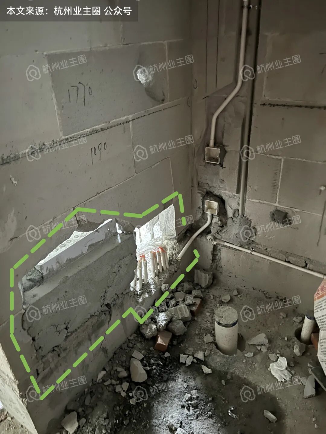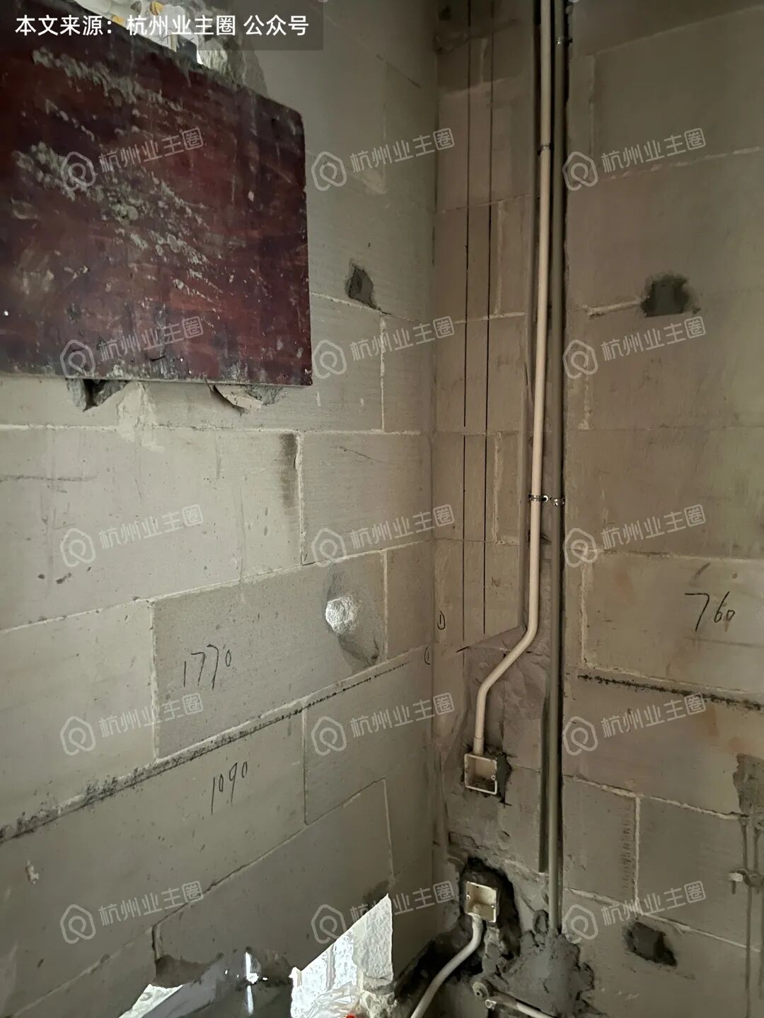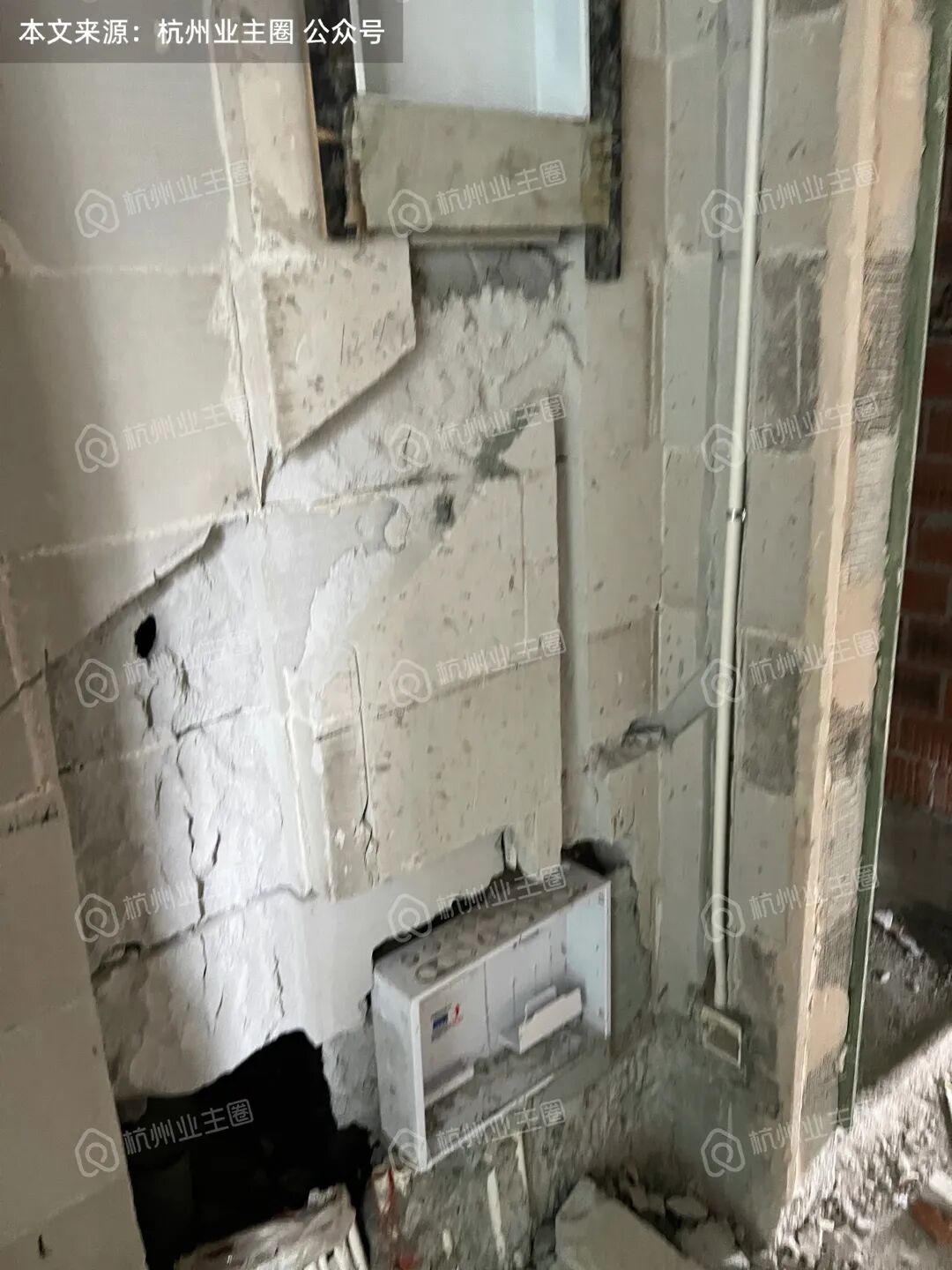 1、120m²户型玄关区域为后砌加气块墙体,强弱电箱开槽后,墙体被凿穿,墙体厚度不足,几乎紧贴暴露于公卫区域,这对后续防水要求较高,如该区域任意一道工序未做到位,就会产生隐患