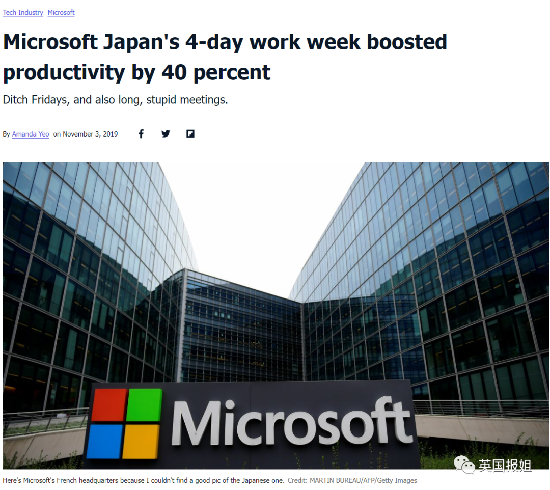 2019年8月,微软日本实行了5个星期的四天工作制:每周五不用上班,不影响工资和年假。