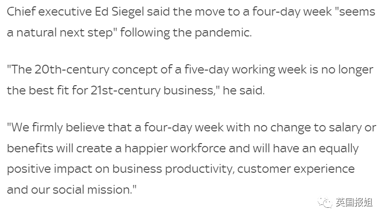 “我们坚信,工资福利不变、每周做四休三会创造出更快乐的员工团队,对企业生产力、客户体验和社会责任产生与之前同样的积极影响。”