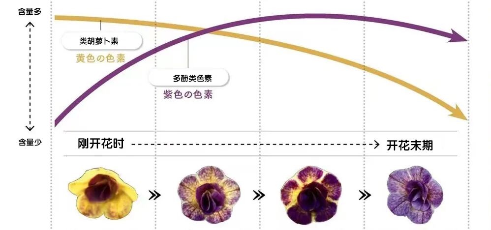 这种颜色的变化其实是因为花瓣中含天然色素:类胡萝卜素(包含黄、橘、红色素)、多酚类色素(包含蓝、紫色素)等。这些天然色素化学性质不稳定,会因高温或氧化等因素降解,所以会随着开花逐渐变色。