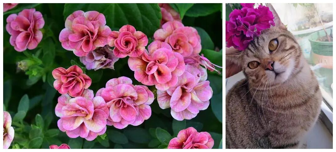 右:重瓣矮牵牛花朵与猫头对比 ©作者