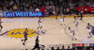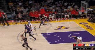 霍师傅接球转身上篮打进 瓜哥翻身后仰中投美如画 首节战罢湖人28-16领先