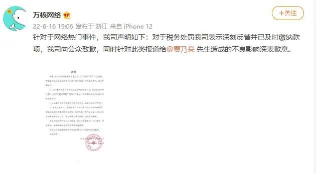 “针对于网络热门事件,我司声明如下:对于税务处罚我司表示深刻反省并已及时缴纳款项,我司向公众致歉,同时针对此类报道给贾乃亮先生造成的不良影响深表歉意。”