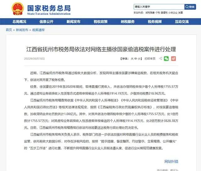 江西省抚州市税务局网站16日消息,近期,江西省抚州市税务局通过税收大数据分析,发现网络主播徐国豪涉嫌偷逃税款,在相关税务机关配合下,依法对其开展了税务检查。