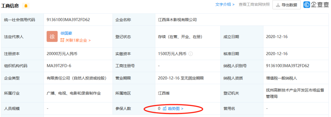 企查查显示,徐国豪共关联1家公司,为江西泽木影视有限公司,该公司成立于2020年12月,徐国豪任法定代表人、执行董事、总经理,公司注册资本2亿人民币,经营范围包括影视美术道具置景服务,摄像及视频制作服务,数字内容制作服务,企业形象策划,文化娱乐经纪人服务,信息咨询服务等,由林庆星、王娜娜共同持股。该公司去年年报显示,其参保人数为0。