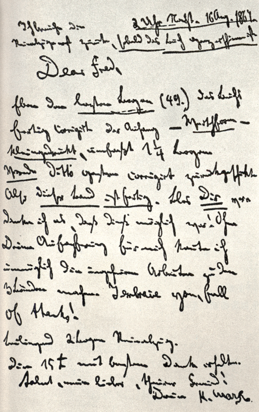 这是1867年8月16日凌晨两点,马克思写给恩格斯的信,龙飞凤舞的字迹透射出了马克思激动的心情,他说:“这本书的最后一个印张刚刚校完……这样,这一卷就完成了……完全要归功于你!没有你为我作的牺牲,我是不可能完成这三卷书的繁重工作的。我满怀感激的心情拥抱你!”1867年8月16日凌晨两点马克思写给恩格斯的信