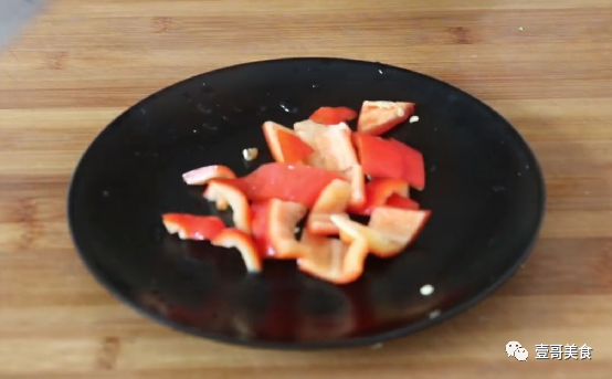 第三步:接下来准备适量的红椒,然后先把红椒放在大碗中,跟着就往大碗中倒入适量的清水和一勺食盐,把红椒清洗干净。接着把清洗干净的红椒放在案板上,用手去掉籽,再切成小块。最后把切好的红椒块装在盘中备用。